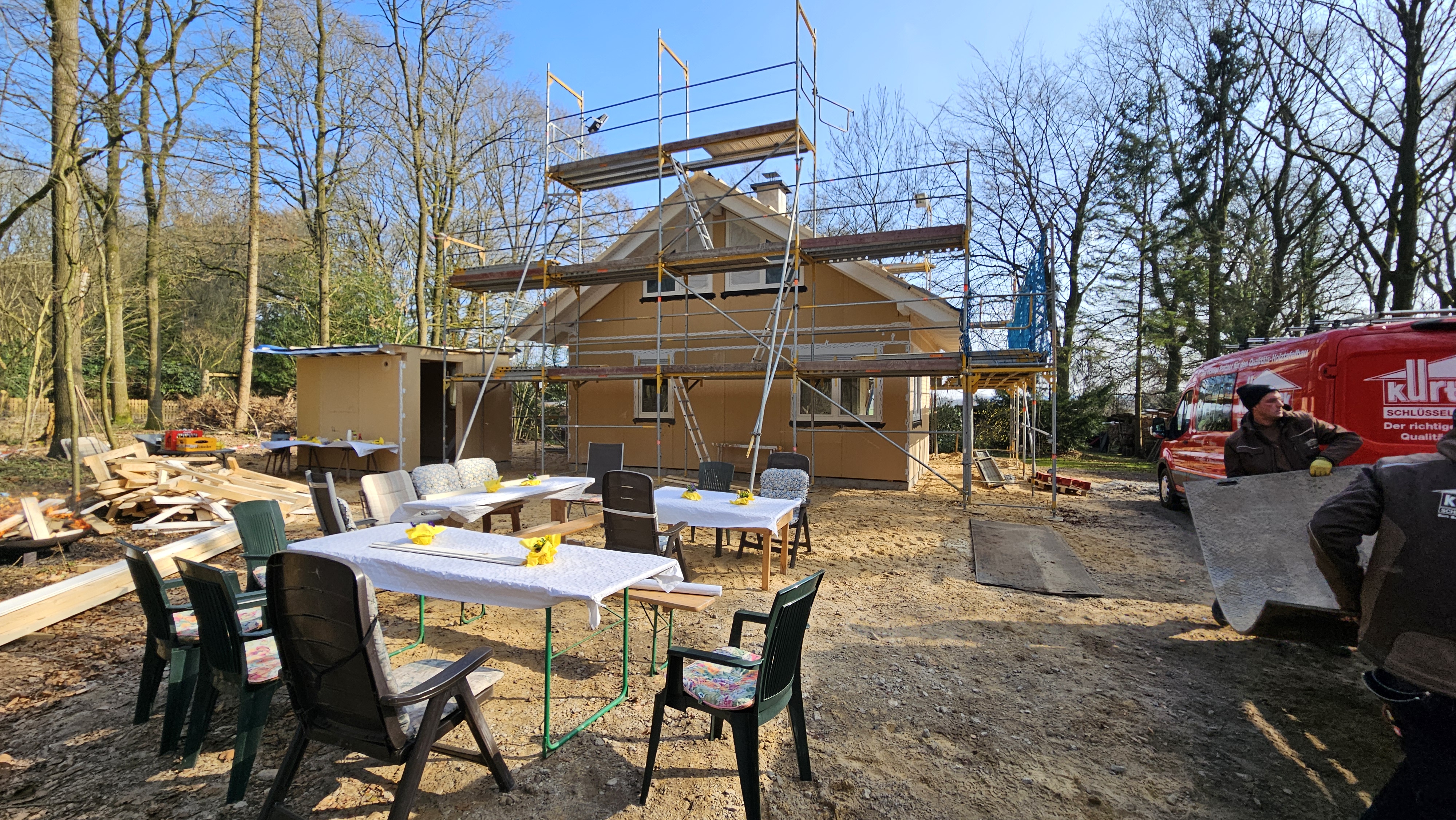 In der 10. KW konnte in Heinschenwalde das Richtfest eines Wochenendhauses gefeiert werden! Unsere Bilder zeigen die Vorfertigung im Werk aus der 6. KW und einige Impressionen des Richtens. Wir gratulieren unseren lieben Bauherren ganz herzlich! Den traditionellen Richtspruch hielt unser Kollege Tjorge, der zusammen mit Joshua und Jonah auf dem Dach zusehen ist bei strahlend blauem Himmel.